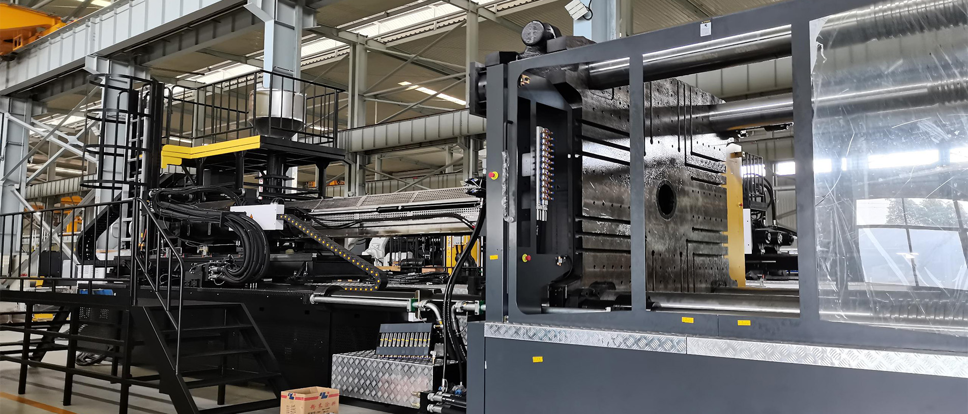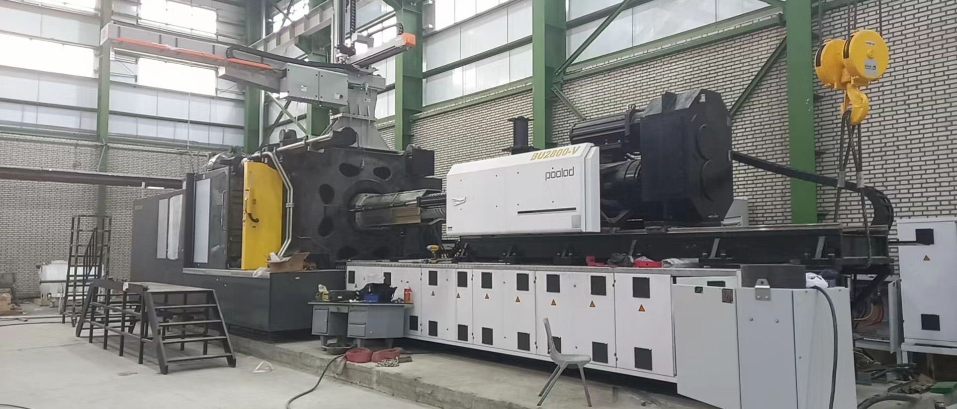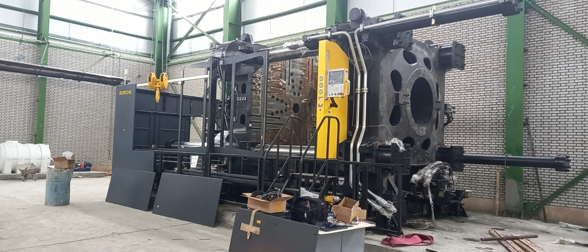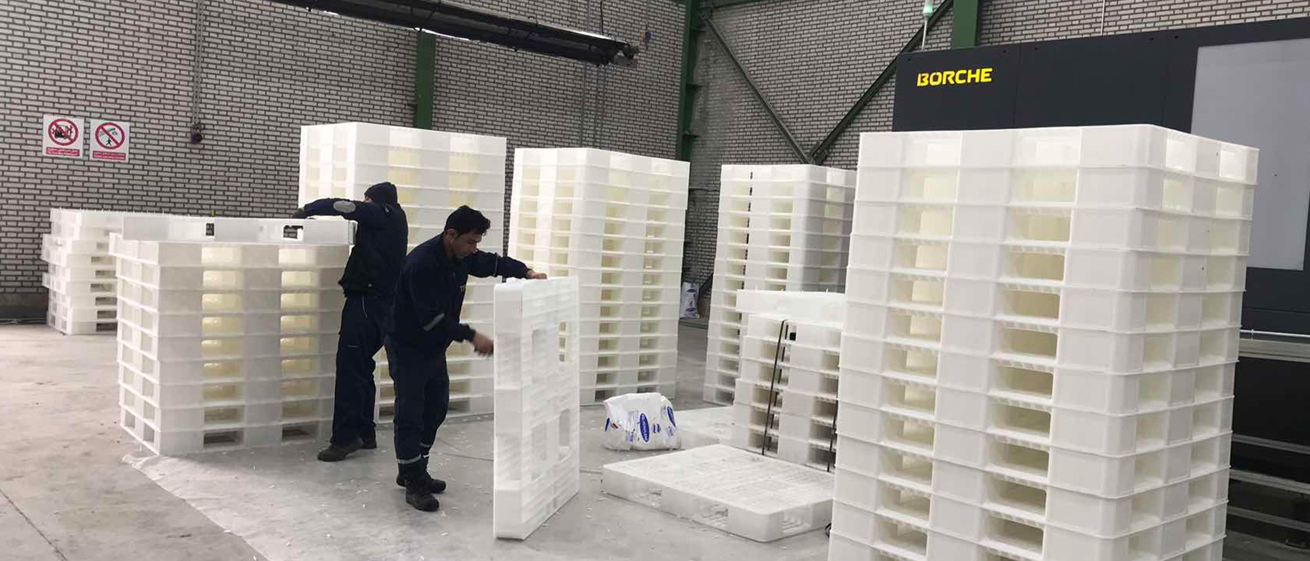 در بخش ماشینآلات، با توجه به درخواست اینکه کارفرما سیکل زمانی تولید یک پالت در حدود ۱۰۰ ثانیه را درخواست کرده بود از طرف کارفرما، می بایست مشخصات فنی ماشین تزریق و تجهیزات جانبی متناسب با این درخواست از حالت استاندارد ارتقا یابد انتخاب دستگاه استاندارد امکانپذیر نبود. اهم تغییرات در ماشین تزریق شامل تجهیز سیستم بارگیری دستگاه به سرووموتور و گیربکس مستقل ، افزایش ظرفیت تزریق ، ارتقای سیستم هیدرولیک و استفاده ار سیستم کنترل دقیقتر بوده. بنابراین دستگاه تزریق مورد نیاز با اصلاحات و تقویتهای فنی سفارشسازی شد؛ از جمله افزایش ظرفیت تزریق، ارتقای سیستم هیدرولیک، تغییرات در واحد گیره و تجهیز دستگاه به کنترلرهای دقیقتر. همچنین بههمراه دستگاه تزریق، ربات مخصوص تخلیه انتقال قطعه، سیستمهای چیلر های خنککاری توان بالا مناسب برای خنک کاری قالب تزریق و روغن هیدرولیک ماشین تزریق ، مجموعه مخزن و پمپ ها بجهت ایجاد سیکل بسته خنک کاری و سیستم انتقال مواد پلیمری متناسب با سرعت تولید انتخاب گردید سایر تجهیزات جانبی نیز ارائه شد و مجموعهای کامل تشکیل داد تا خط تولیدی بهصورت مستقل، پایدار و با راندمان بالا کار کند ایجاد گردد.