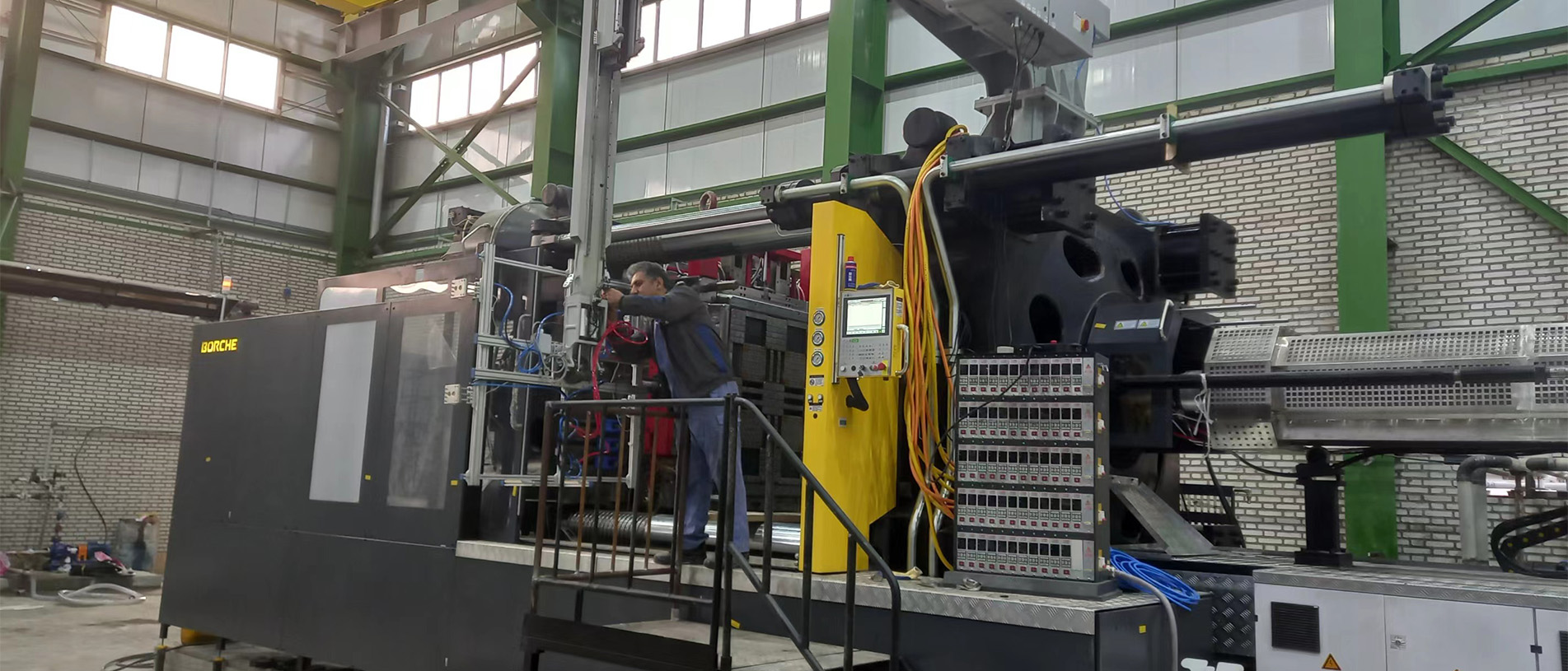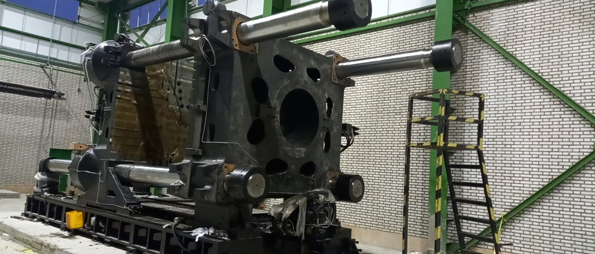 در بخش ماشینآلات، با توجه به درخواست اینکه کارفرما سیکل زمانی تولید یک پالت در حدود ۱۰۰ ثانیه را درخواست کرده بود از طرف کارفرما، می بایست مشخصات فنی ماشین تزریق و تجهیزات جانبی متناسب با این درخواست از حالت استاندارد ارتقا یابد انتخاب دستگاه استاندارد امکانپذیر نبود. اهم تغییرات در ماشین تزریق شامل تجهیز سیستم بارگیری دستگاه به سرووموتور و گیربکس مستقل ، افزایش ظرفیت تزریق ، ارتقای سیستم هیدرولیک و استفاده ار سیستم کنترل دقیقتر بوده. بنابراین دستگاه تزریق مورد نیاز با اصلاحات و تقویتهای فنی سفارشسازی شد؛ از جمله افزایش ظرفیت تزریق، ارتقای سیستم هیدرولیک، تغییرات در واحد گیره و تجهیز دستگاه به کنترلرهای دقیقتر. همچنین بههمراه دستگاه تزریق، ربات مخصوص تخلیه انتقال قطعه، سیستمهای چیلر های خنککاری توان بالا مناسب برای خنک کاری قالب تزریق و روغن هیدرولیک ماشین تزریق ، مجموعه مخزن و پمپ ها بجهت ایجاد سیکل بسته خنک کاری و سیستم انتقال مواد پلیمری متناسب با سرعت تولید انتخاب گردید سایر تجهیزات جانبی نیز ارائه شد و مجموعهای کامل تشکیل داد تا خط تولیدی بهصورت مستقل، پایدار و با راندمان بالا کار کند ایجاد گردد.